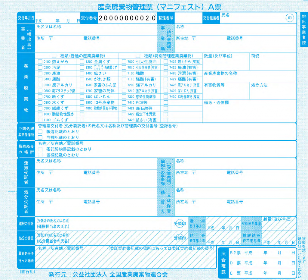 排出事業者が産業廃棄物の処理を委託する際には、収集運搬を委託する契約と処分を委託する契約の双方を結び、許可業者等へ処理委託しなければなりません。産業廃棄物の不法投棄を防止し、産業廃棄物の適正処理を確保するため、排出業者は産業廃棄物の処理を委託する際には、産業廃棄物の流通経路が確認できるように産業廃棄物管理票(マニフェスト)の交付が義務づけられています。このため、1993年4月に複写式伝票(紙マニフェスト)を用いて特別管理産業廃棄物だけを対象にしたマニフェスト制度が、厚生省(現環境省)の行政指導で始まりました。そして1998年12月からはマニフェストの適用範囲がすべての産業廃棄物に拡大されています。