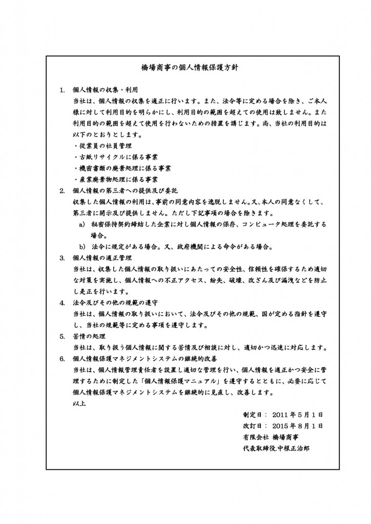 当社は、お客様より依頼される廃棄物処理業務を通じて個人情報の機密保持とその適切な処理についての業責任を果たしてまいりました。業務を通じて知りえた個人情報及び廃棄物に含まれる個人情報について「個人情報の保護に関する法律」を遵守するとともに、基本方針を定め、適正かつ安全な管理を実施し、維持することを宣言します。